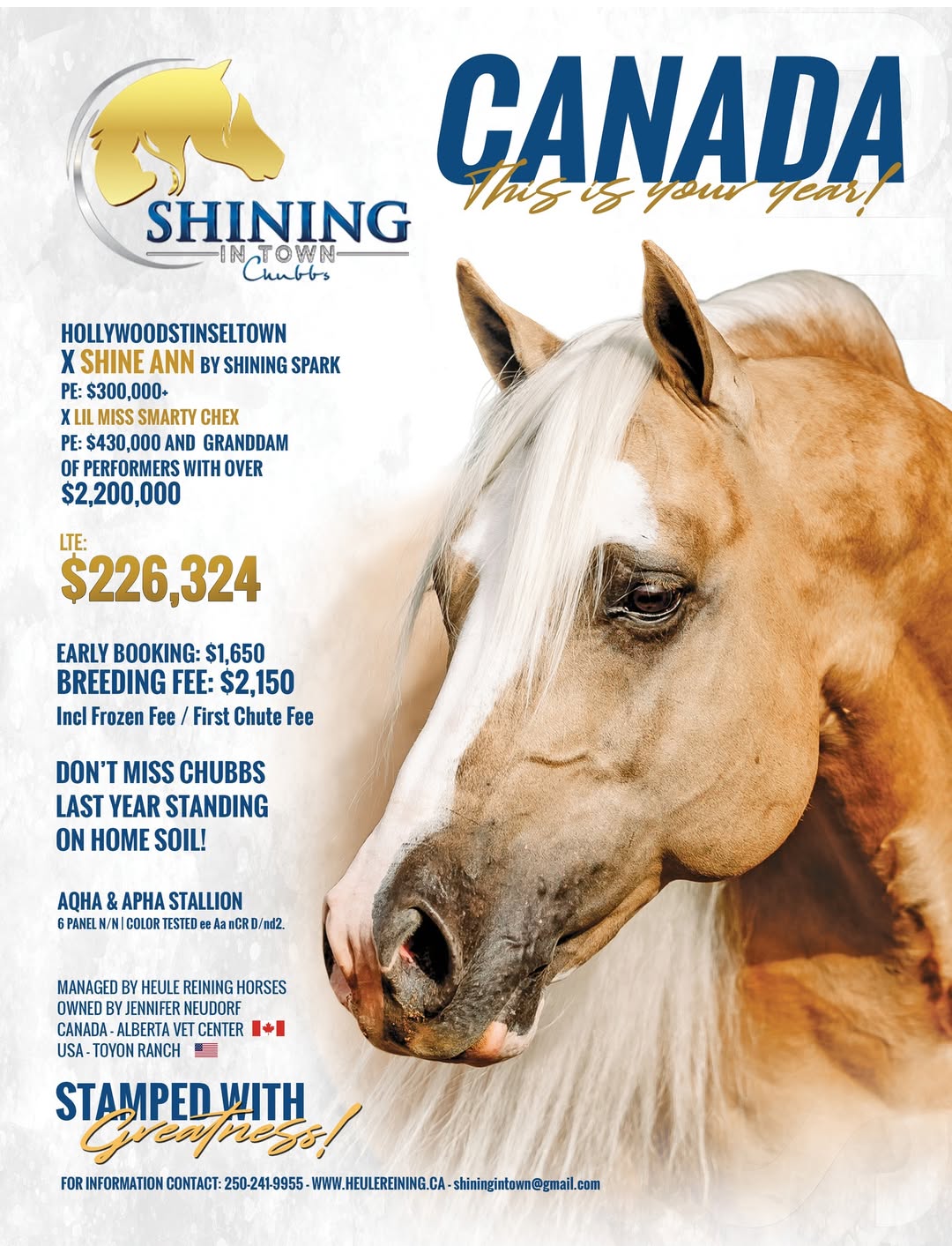 Shining In Town (“Chubbs”), bred by the legendary Carol Rose, is proving himself as a sire. Stamped with greatness from birth, he carries a pedigree anchored by Hollywoodstinseltown and Shine Ann (PE $250k), with second dam Lil Miss Smarty Chex producing and influencing over $2 million in earners. Chubbs is consistently passing on his hallmark traits — form-tofunction conformation, athleticism, presence, and willingness to please.